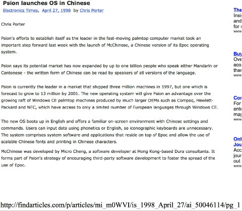 Back in 1998, my software, "McChinese" which was featured on the PSION Plc website. Although the original press release is no longer available online, I was able to locate a record of it in the Electronics Times.